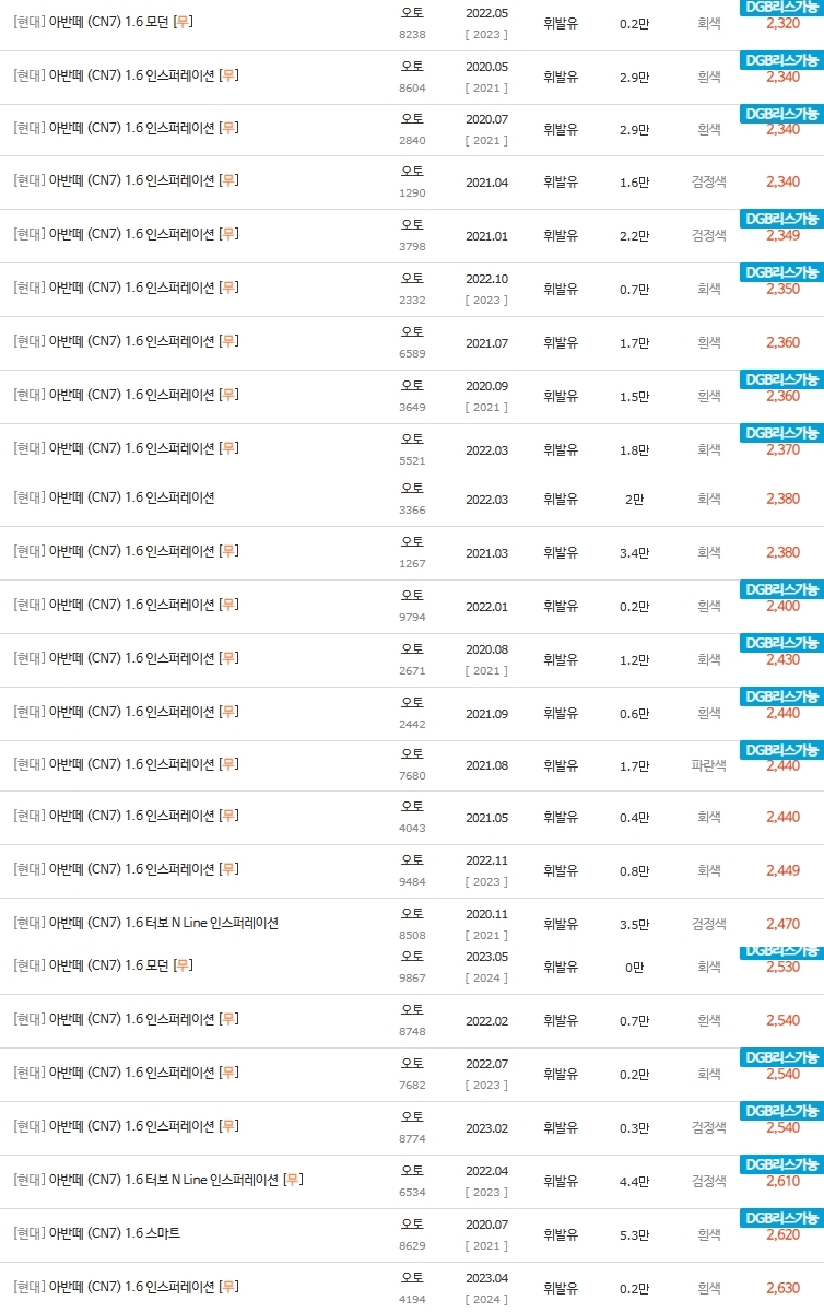 2300대까지의 아반떼 cn7 중고차 시세표가격입니다
