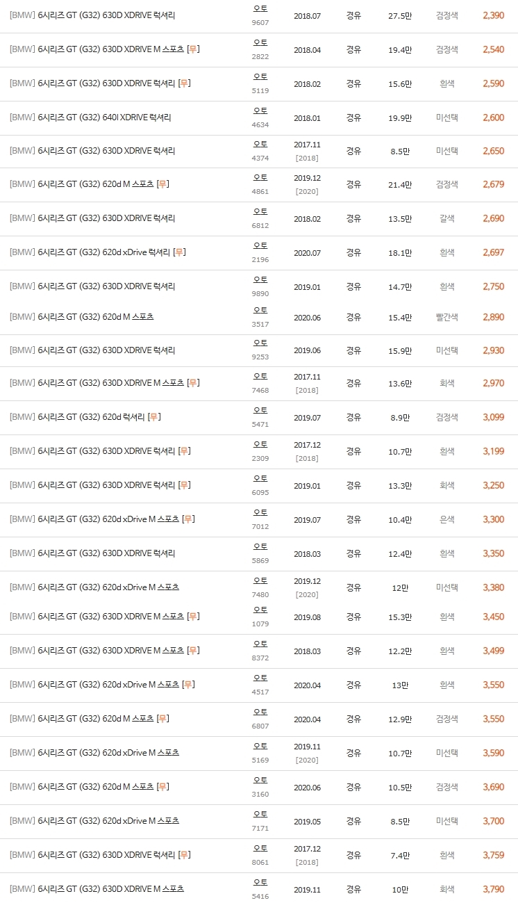 6500대까지의 bmw 6gt 중고차 시세표 모음입니다