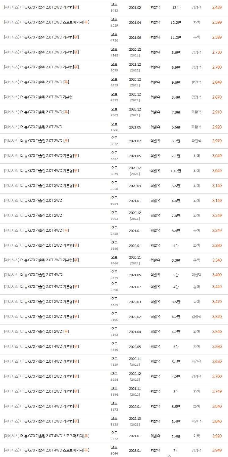 3900대까지의 제네시스 더뉴 g70 중고차 시세표 모음입니다