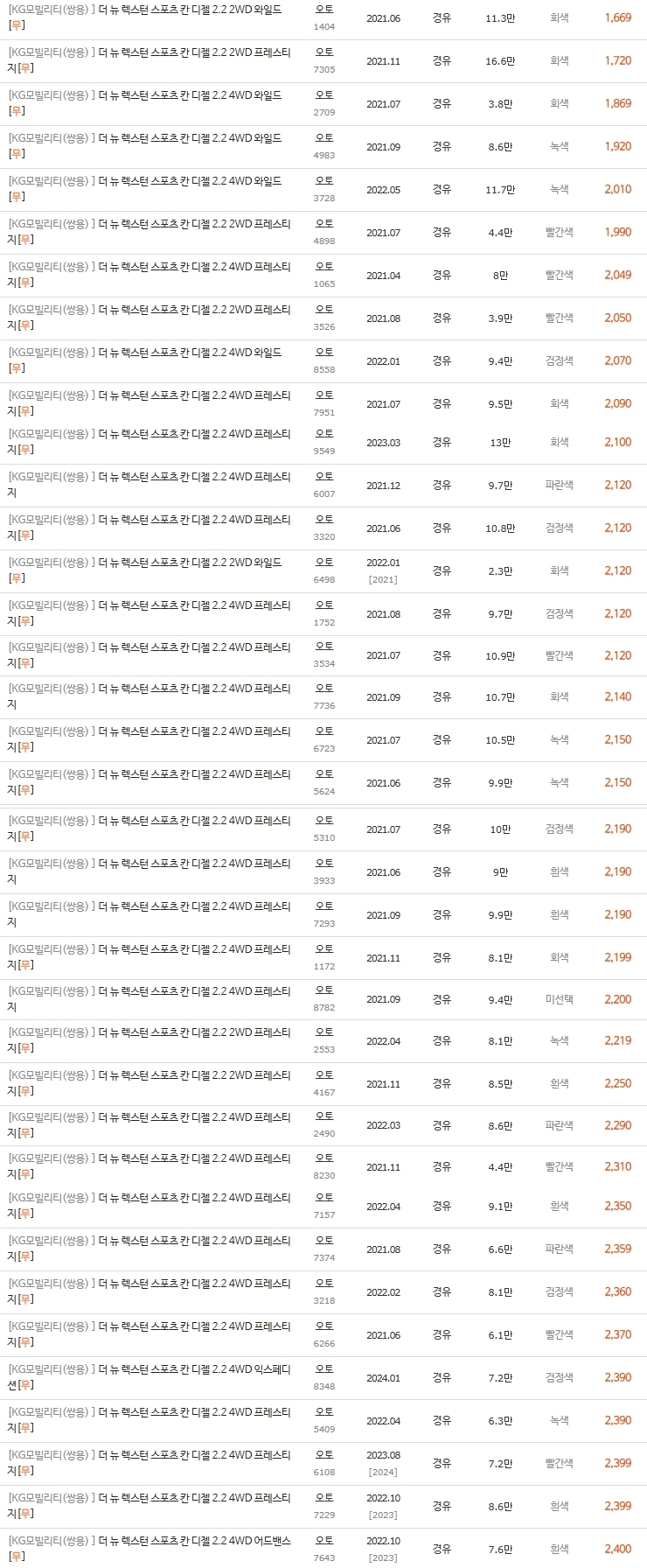 - 2륜 모델이 주로 구성되어 있어 가격이 낮은 편