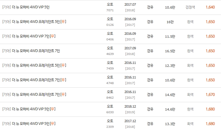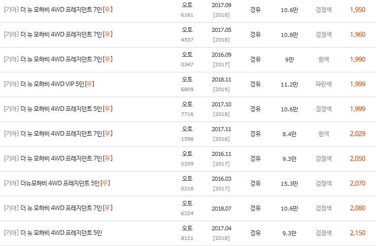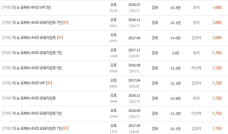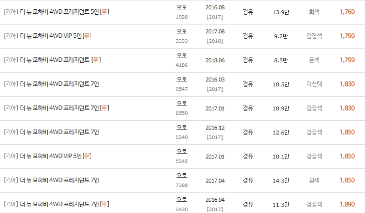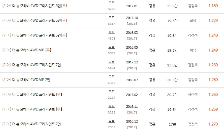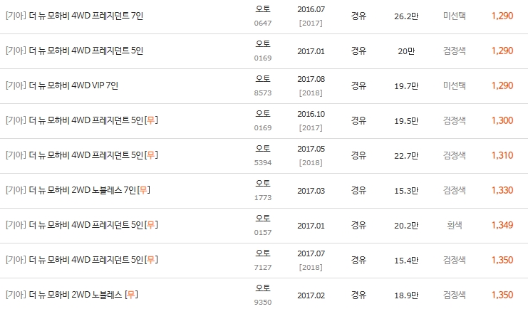 💸 가격대별 더뉴모하비 중고차 시세 분석
