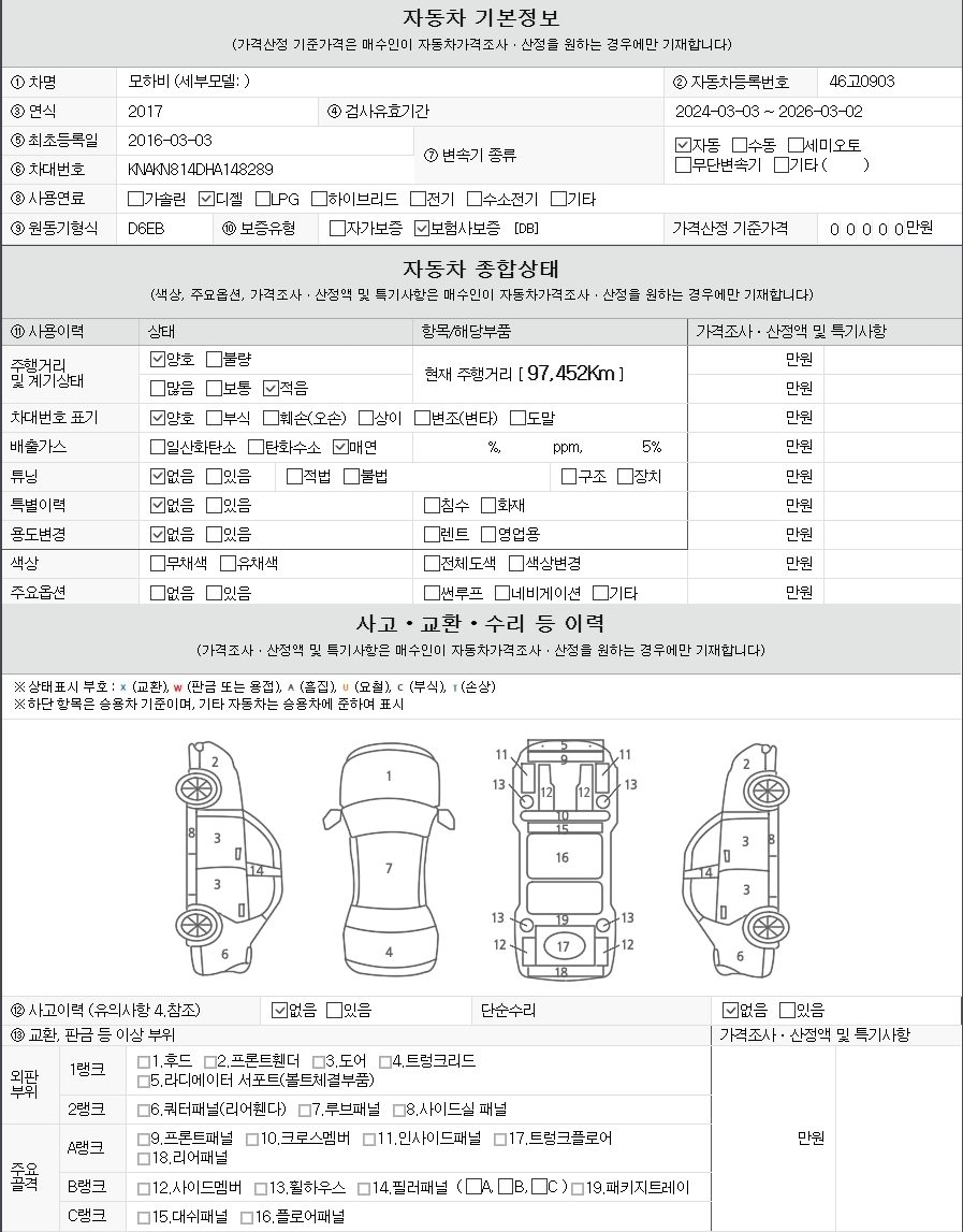 | 차량명 | 기아 더뉴모하비 4WD 프레지던트 |