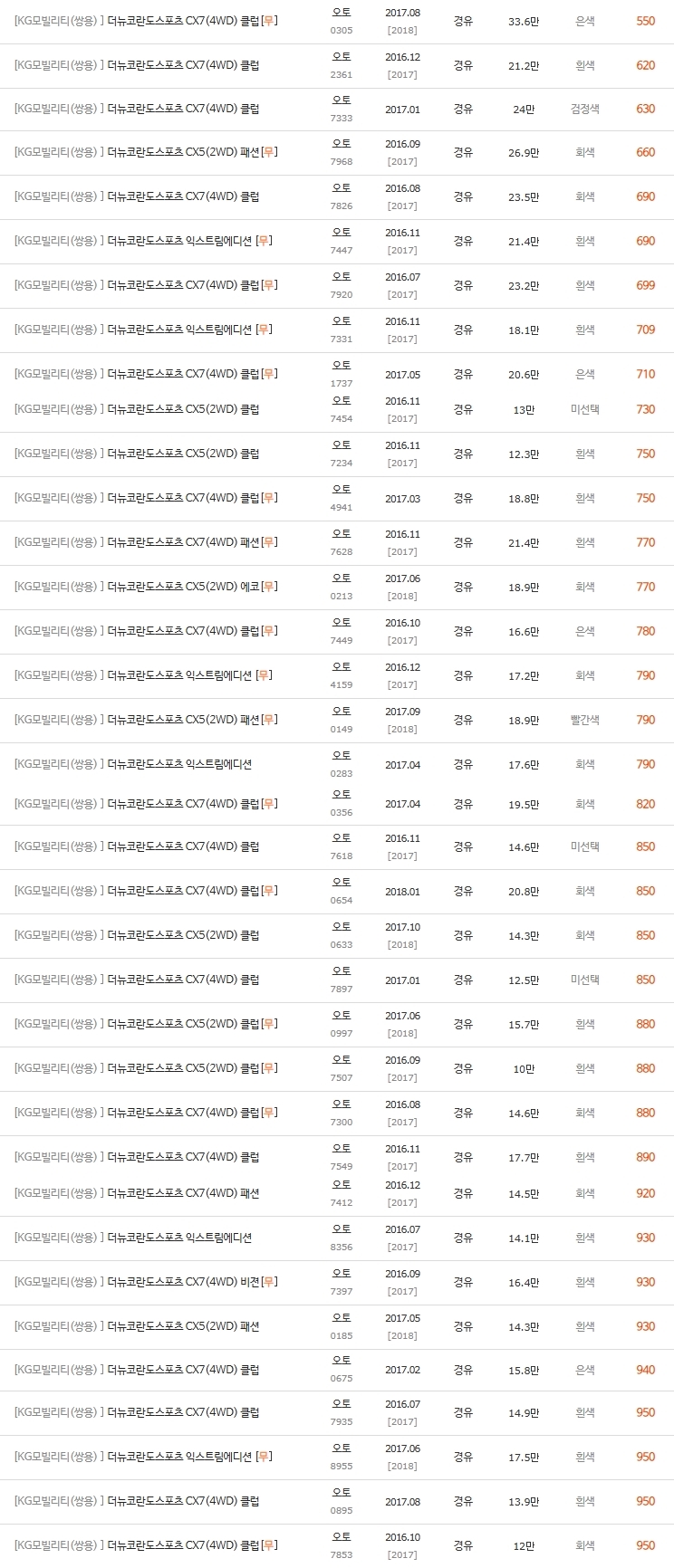 - 700만 원대 이후부터는 주행거리가 10만 km 중후반대로 낮아진 매물들이 보이기 시작합니다. 클럽(Club)이나 패션(Fashion) 등 기본 트림이 주를 이루며, 연식 대비 주행거리가 높은 모델을 찾는 분들에게 적합합니다.