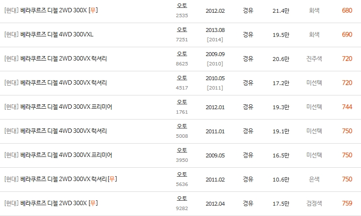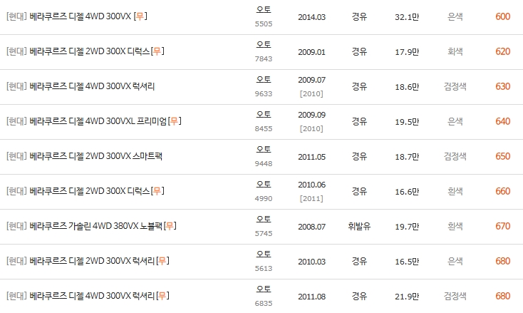 베라크루즈는 '연식'과 '주행거리' 그리고 '엔진 형식' 세 가지 요소가 시세를 가르는 가장 중요한 기준입니다.