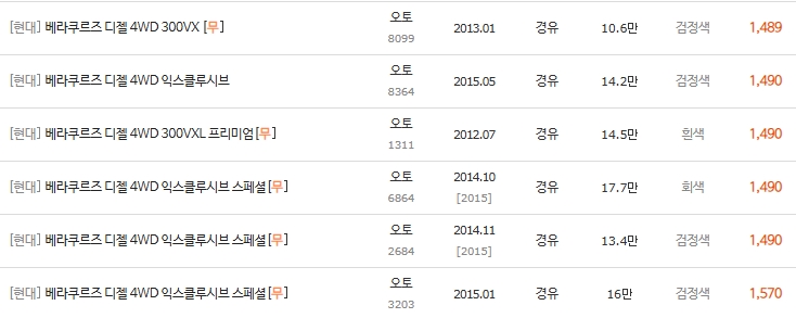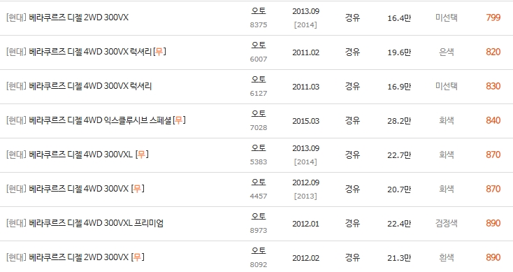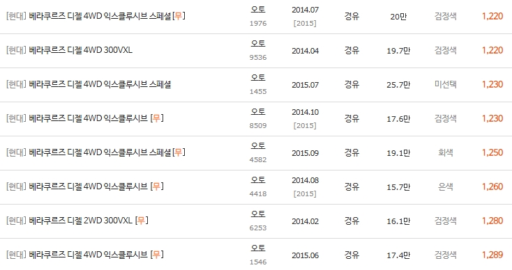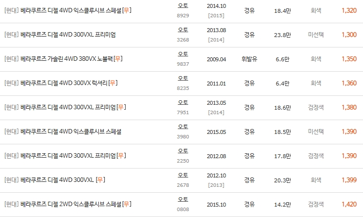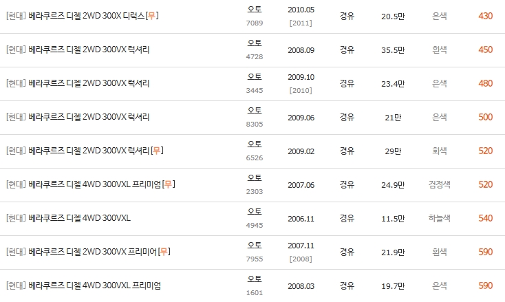 현재 경기도권 상품용으로 판매 중인 베라크루즈 중고차 시세는 400만 원 초반부터 최대 1,500만 원대까지 폭넓게 형성되어 있습니다.