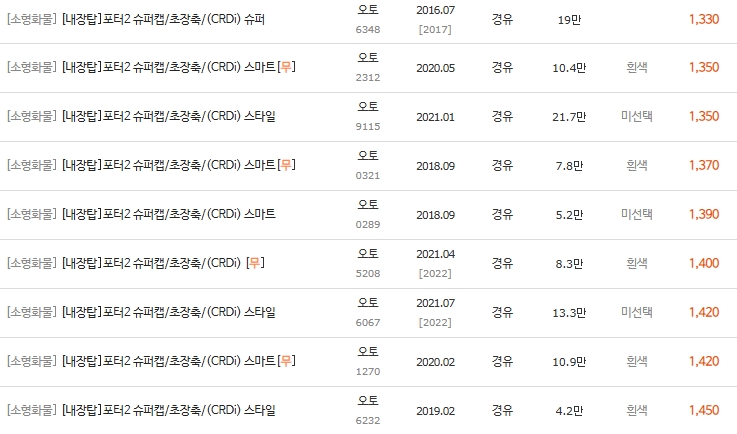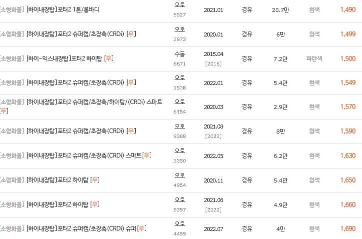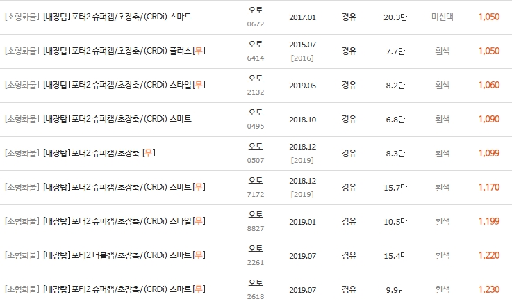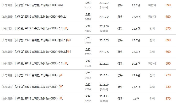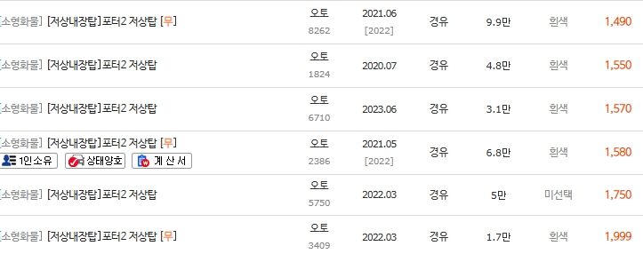 📊 2-3. 포터2 디젤 저상탑 시세표 (600만 ~ 1,900만 원대)