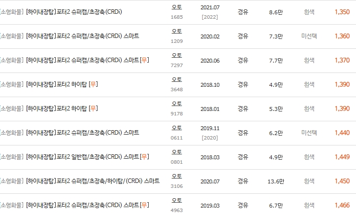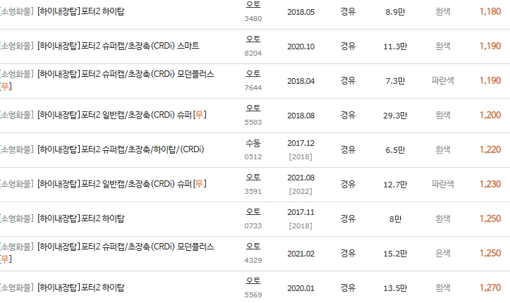 📊 2-2. 포터2 디젤 하이탑 (고상) 시세표 (1,100만 ~ 2,000만 원대)