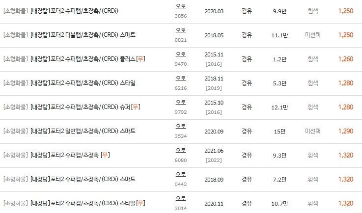📊 2-1. 포터2 디젤 일반 내장탑 시세표 (500만 ~ 2,100만 원대)