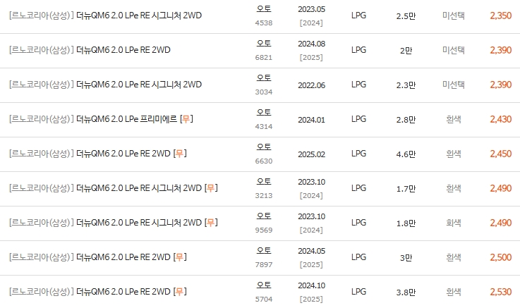 더 뉴 QM6 LPe의 중고차 시세는 현재 900만 원대부터 2,500만 원대까지 폭넓게 형성되어 있습니다. 중고차는 옵션, 주행거리, 그리고 가장 중요한 사고 유무에 따라 시세가 천차만별입니다.