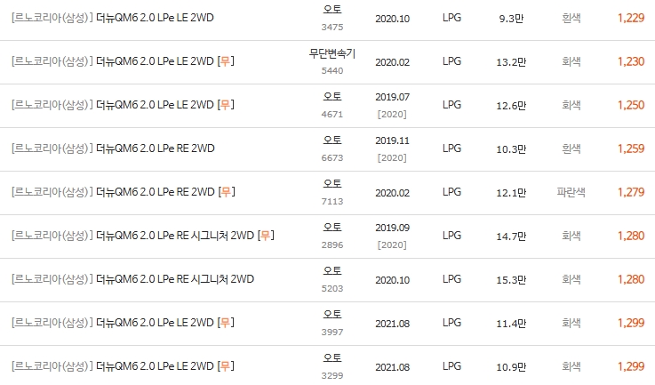 - 사고 이력이 있는 차량(표시 없음)들이 다수 포함되며, 10만 km 초중반대의 LE, RE 트림 차량들이 보입니다.