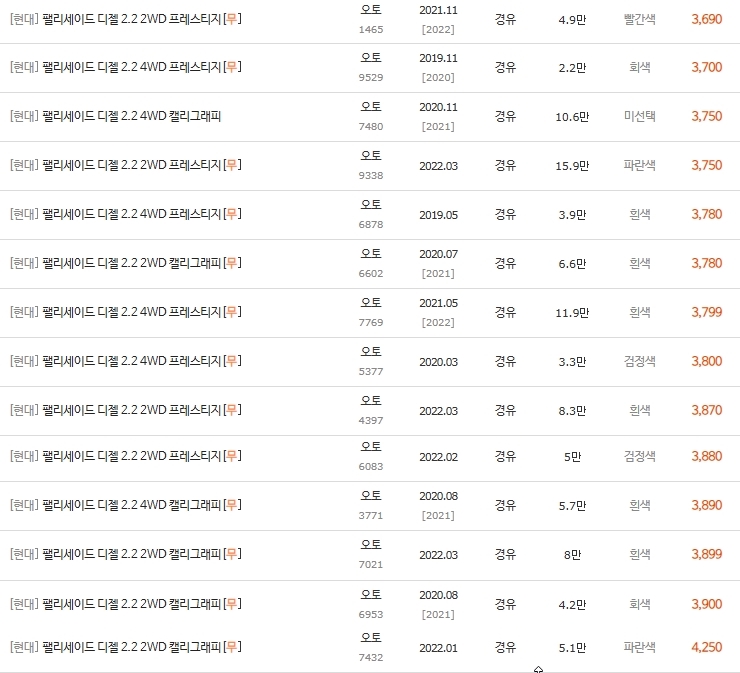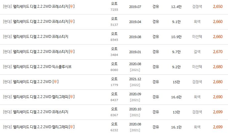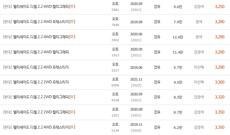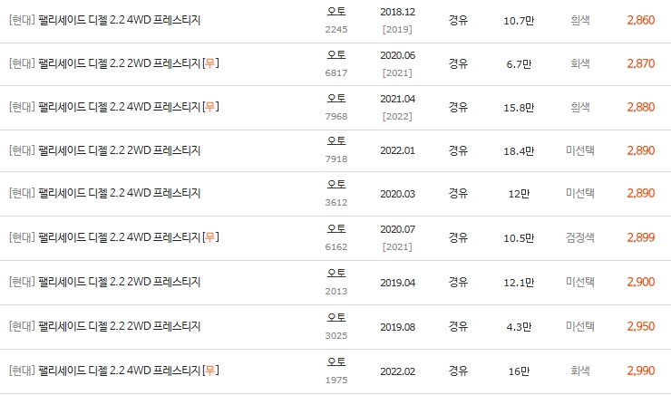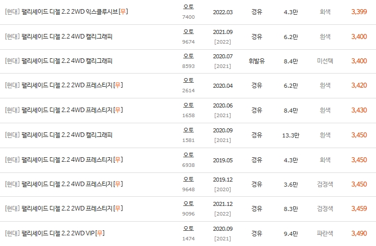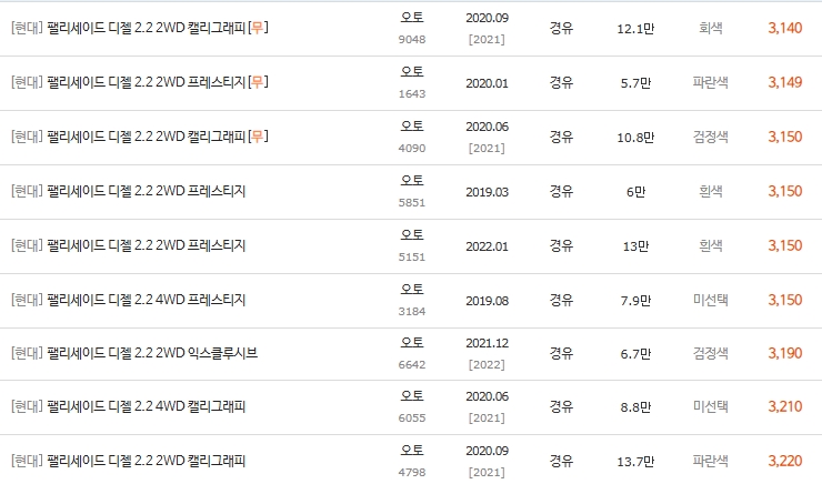 오늘 팰리세이드 2.2 디젤 중고차 시세를 정리해 보았습니다. 중고차 구입은 기준을 정하는 것이 가장 중요합니다.