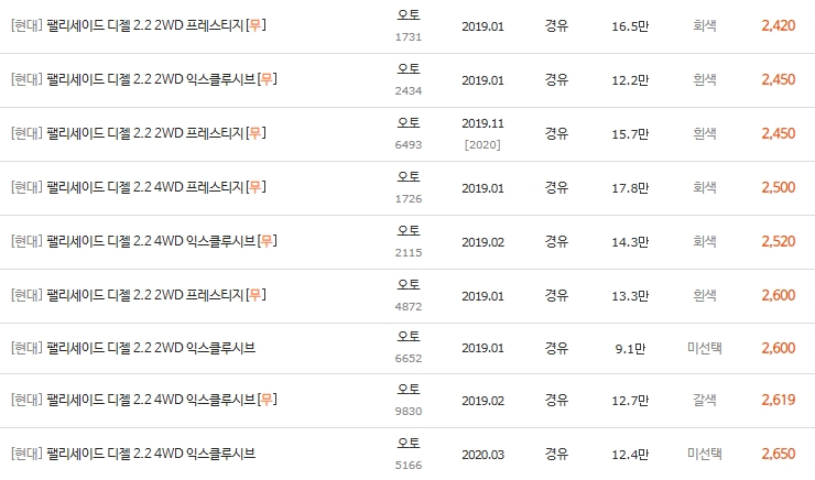 이 구간에서는 주로 **10만 km 중반대 이상의 차량**들이 확인됩니다. 19~20년식 차량이 많으며, 2600만 원 이후부터 10만 km 초반대의 차량들이 보이기 시작합니다.