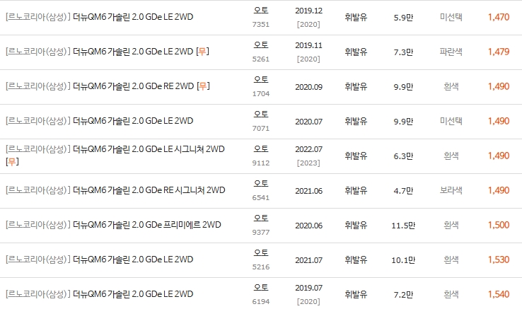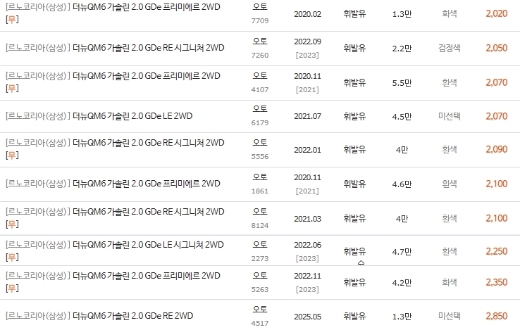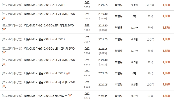 더 뉴 QM6 휘발유 모델의 중고차 가격은 주행거리, 연식, 그리고 트림(옵션) 이 세 가지 요소에 의해 결정됩니다. 특히 RE 트림 이상부터는 편의 옵션의 만족도가 급상승합니다.