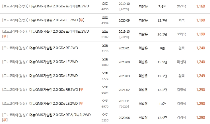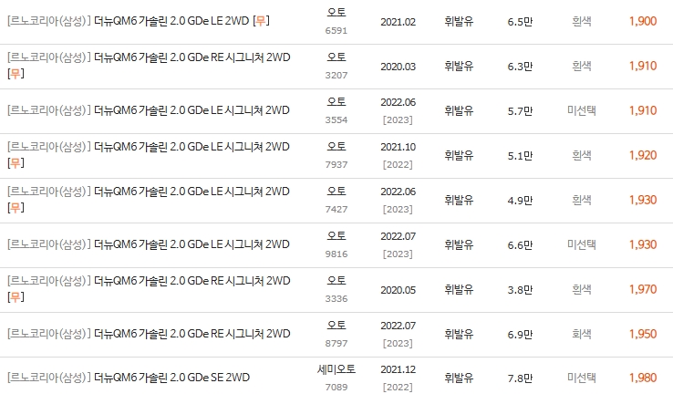 이 구간은 20만km 이상 고주행 차량이나 프레임 교환이 있는 사고 차량들이 최저가에 위치합니다. 단순히 저렴한 가격만 보고 덜컥 계약하면 안 됩니다.