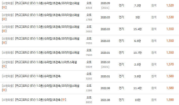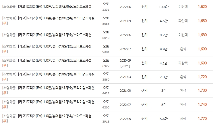 💰 1800대까지의 포터2 EV 중고차 시세표 모음