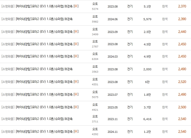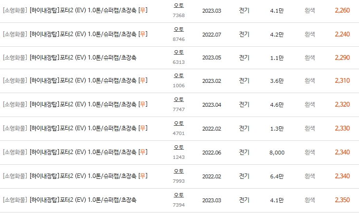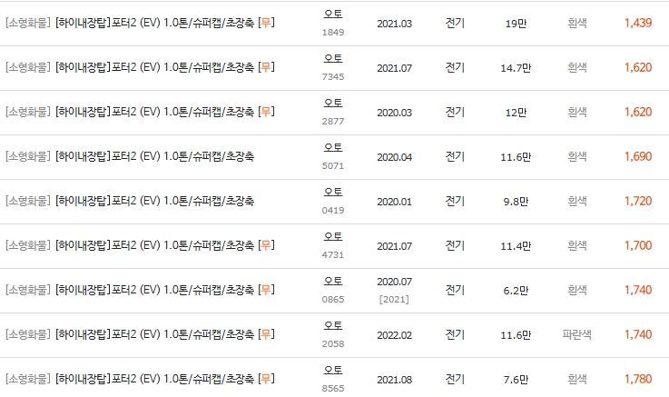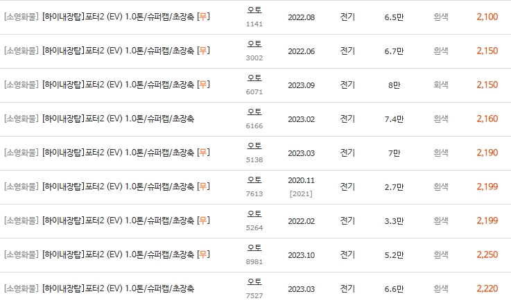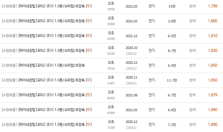 - - 주로 20~21년식 초반 차량들이 보이며, 주행거리는 10만km를 훌쩍 넘는 경우가 많습니다. 저렴한 가격에 EV 탑차를 경험하고 싶다면 이 구간을 보셔야 합니다.