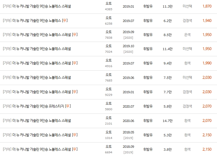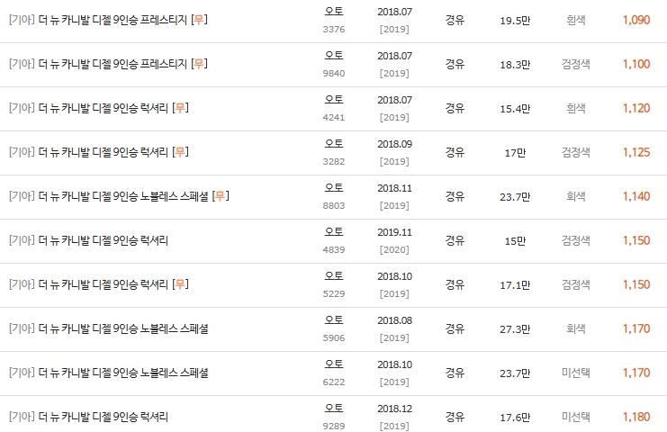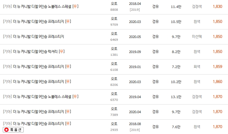 - 1900만원 이후에는 노블레스 스페셜의 10만km 이하 차량들이 주를 이루며,