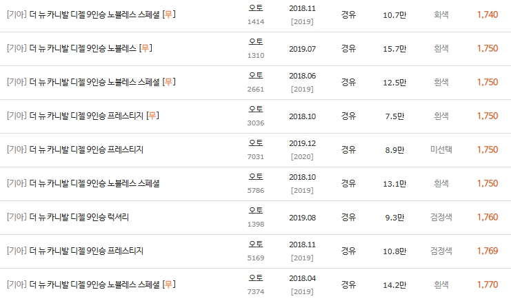 - 중후반부 (1700만원대~2100만원대): 1700만원 이후로 10만km 이하 차량들이 보이기 시작합니다.