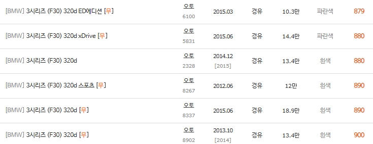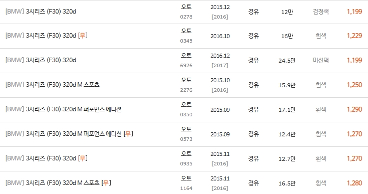 1,300만 원대 이상부터 10만km 이하 짧은 주행거리 매물이 다양해지며, 1,600만 원 이상 상위 시세에는 M 스포츠 패키지 등 고스펙 차량들이 주를 이룹니다.