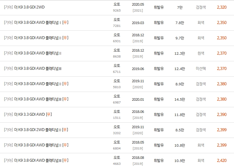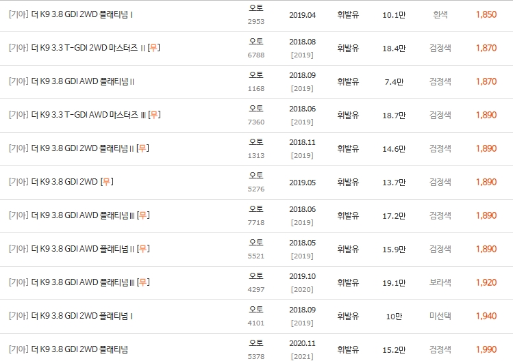 • 2,000만 원 초반: 실속 있는 18~19년식 3.8 플래티넘 2 추천!