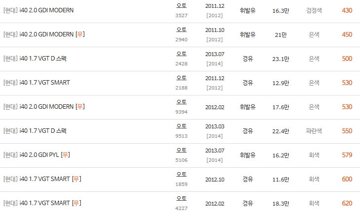 ✅ 가성비 출퇴근용: i40 살룬 + 디젤 + 주행거리 15만km 내외 (400~600만 원대 추천)