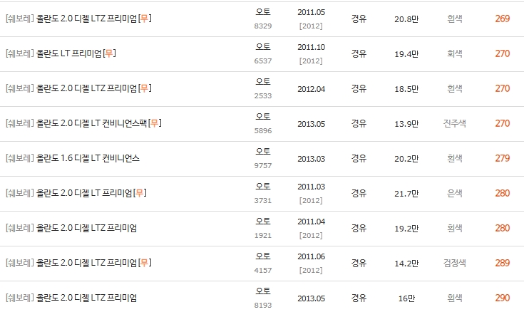 2. 쉐보레 올란도 디젤 중고 시세표 구간별 정리