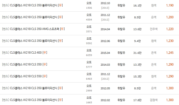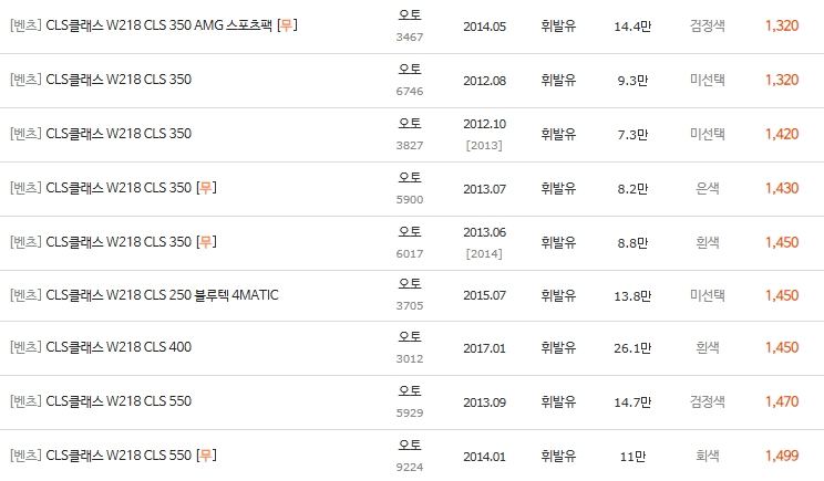 • 하위권(500~1,400만): 초기형 CLS 350 위주. 주행거리 15~20만km 이상의 매물이 많습니다.