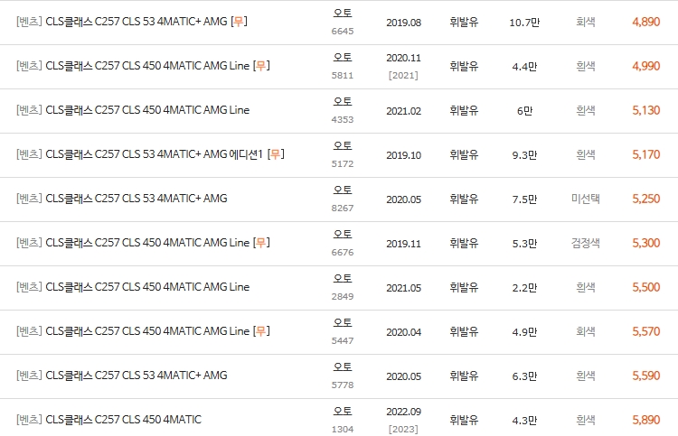 💰 벤츠 CLS 중고차 휘발유 모델 상세 시세표 (450, 53 AMG)