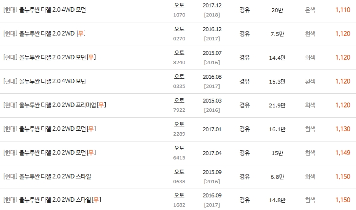 💰 올뉴투싼 2.0 디젤 상세 중고차 시세표