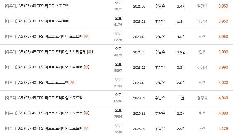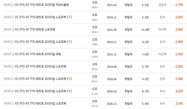 2️⃣ 아우디 A5 F5 중고차 시세 (2019~2024년)