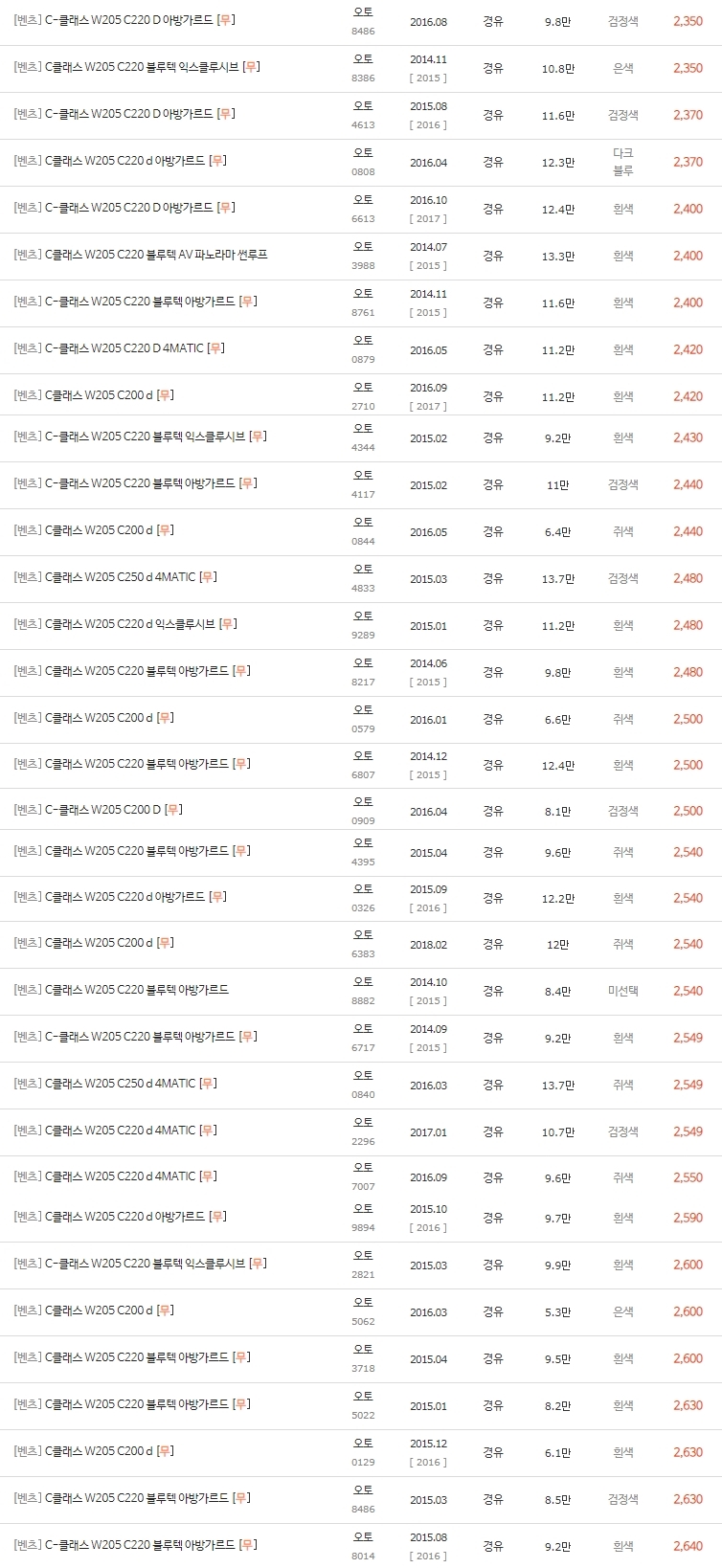 2300대까지의 벤츠 c클래스 중고차 시세표 가격입니다